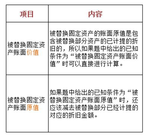 此類題目中常常出現(xiàn)已知條件為“被替換固定資產(chǎn)賬面價(jià)值”和“被替換固定資產(chǎn)賬面原值”,這兩種已知條件的含義是不一樣的。
