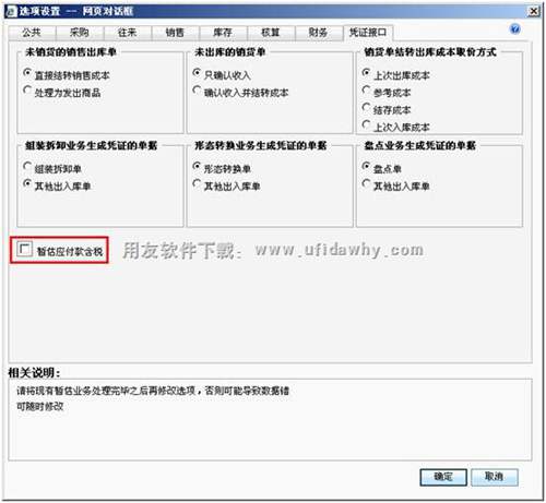 3、依次點擊“系統(tǒng)管理”-“賬套設(shè)置”-“選項設(shè)置”按鈕,在“憑證接口”頁簽下,把“暫估應(yīng)付款含稅”的勾去掉: