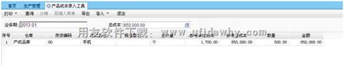 b、進(jìn)行成本錄入之前先算出一個手機(jī)需要多少成本(500+100+400+580+120=1700);總成本為(500*1700=850000);錄好后再進(jìn)行回填入庫單操作: