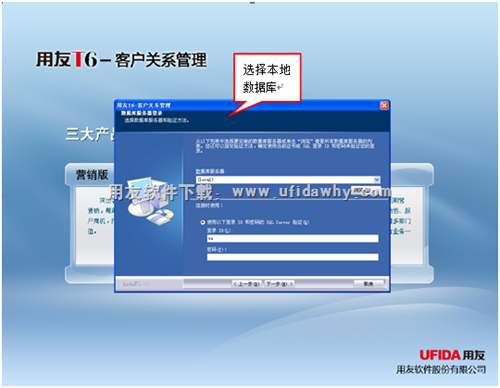 8、選擇本地數(shù)據(jù)庫服務器,如下圖,在數(shù)據(jù)庫服務器處輸入(local),登錄ID為SA,如果是按前面的教程安裝的數(shù)據(jù)庫,則密碼處不用填寫,如果是自己安裝的數(shù)據(jù)庫設置過SA密碼,請在密碼處輸入數(shù)據(jù)庫SA密碼,如果不記得,請參照修改SA口令的教程進行操作,填寫數(shù)據(jù)庫管理員登錄賬號后,點擊【下一步】,如下圖所示: