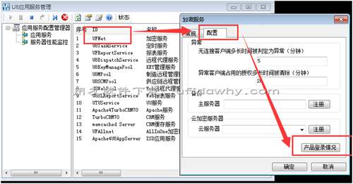 雙擊一下就會(huì)出現(xiàn)用友U8應(yīng)用服務(wù)管理的界面,在找到 UFNET 這個(gè)加密服務(wù),單擊右鍵屬性,然后在彈出的界面的配置里有個(gè)產(chǎn)品登陸情況,點(diǎn)開(kāi)就可以看到當(dāng)前用友U8軟件的加密狗的模塊及站點(diǎn)數(shù)了。