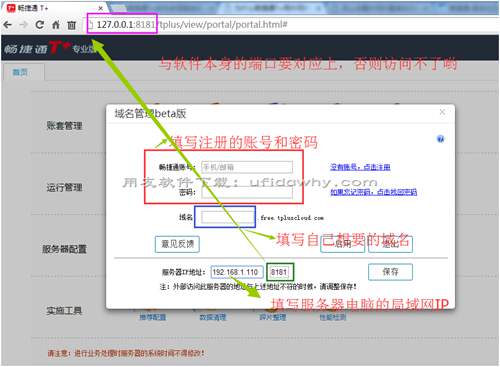 c、填寫你剛剛注冊的用戶名和密碼,設置一個域名,這個就是你以后外網訪問暢捷通T+的地址,所以可以是公司名稱的首字母拼音,方便記憶。下面的端口填寫要注意和用友T+財務管理軟件開放的端口一致,否則會出現外網訪問不了的情況。