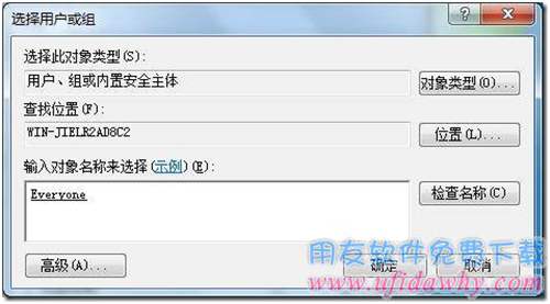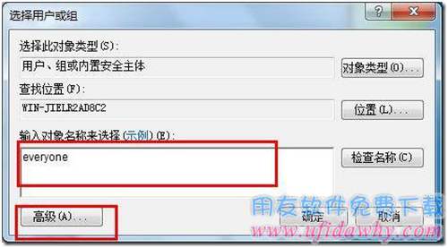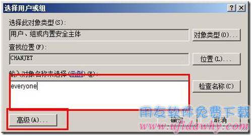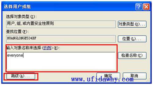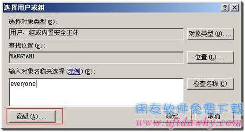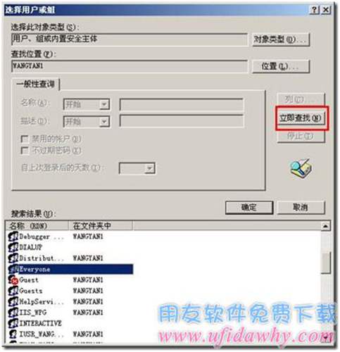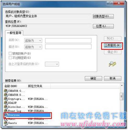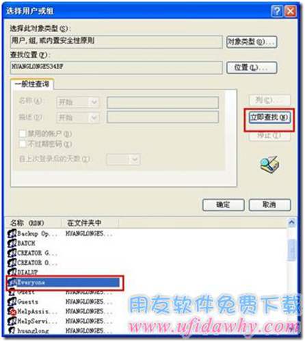 (3)在選擇用戶或組窗口中點(diǎn)擊“高級(jí)”,再點(diǎn)擊“立即查找”,找到需要添加的用戶,如everyone,再點(diǎn)擊“確定”如下圖所示: