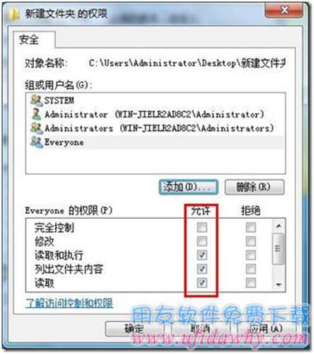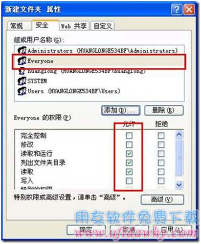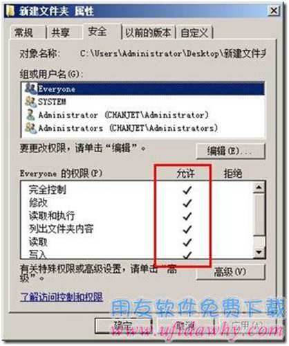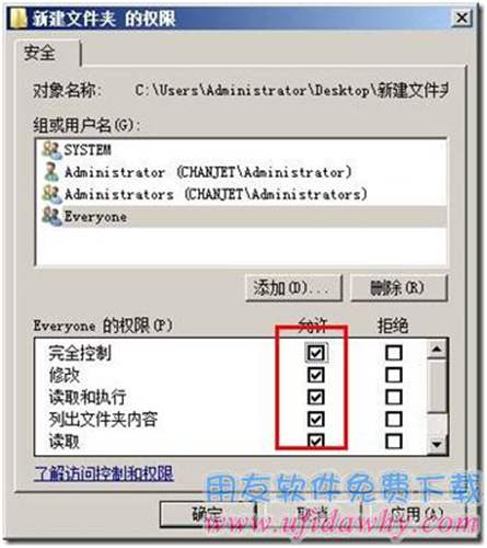 (5)在everyone的權(quán)限框里勾上完全控制,再點(diǎn)擊“確定”文件夾權(quán)限分配就完成了。