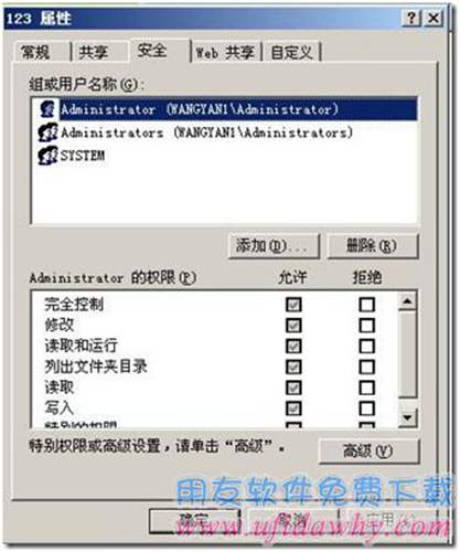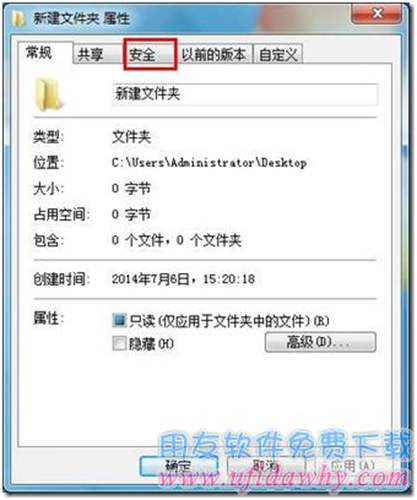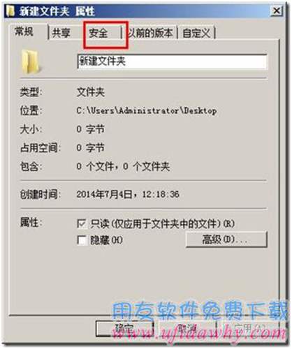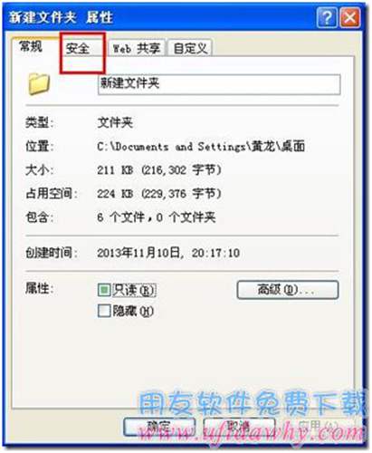 (2)設(shè)置好后單擊需要設(shè)置文件夾權(quán)限的文件夾,右鍵選擇“屬性”,在窗口里有一個(gè)“安全”頁(yè)簽,如下圖所示: