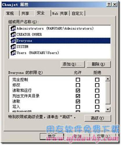 2、windows server 2003操作系統(tǒng):下面舉例說(shuō)明給chanjet文件夾添加“eneryone”用戶完全控制的權(quán)限