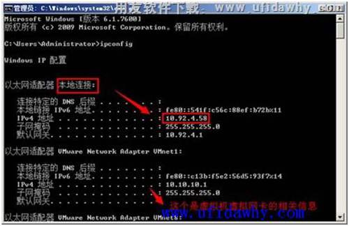 1、點(diǎn)擊“開(kāi)始”-“運(yùn)行”-輸入“CMD”進(jìn)入DOS界面,輸入ipconfig,查看當(dāng)前計(jì)算機(jī)的IP地址(要注意區(qū)分本地連接,無(wú)線(xiàn)連接,虛擬網(wǎng)卡等),如下圖所示: