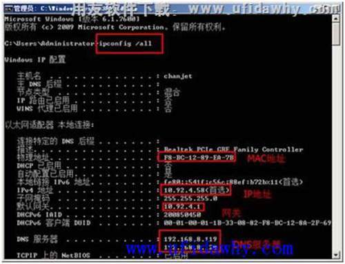 2、點(diǎn)擊“開(kāi)始”-“運(yùn)行”-輸入“CMD”進(jìn)入DOS界面,輸入ipconfig all,查看所有TCP/IP配置相關(guān)信息,如下圖所示: