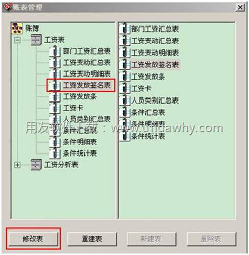 3、在“我的賬表”中修改工資發(fā)放簽名表的格式:點擊“工資”-“統(tǒng)計分析”-“我的賬表”選中發(fā)放簽名表,點“修改表”,如下圖所示: