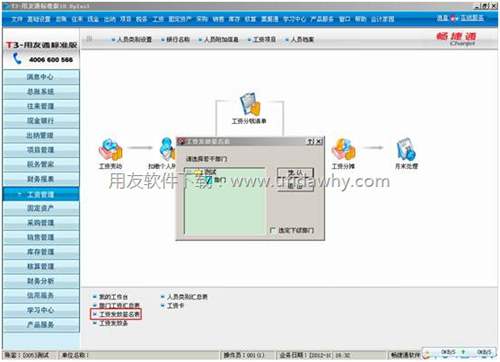 2、查看工資發(fā)放簽名表,點工資-工資發(fā)放簽名表,單擊部門,選中部門后點“確認”,如下圖所示:
