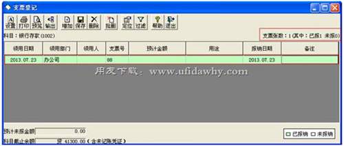 c、支票報銷完之后,再次點擊“現(xiàn)金”菜單欄-“票據(jù)管理”-“支票登記簿”選擇“銀行存款”科目,確定,提示支票張數(shù)1張,已報銷1,未報銷0,就說明報銷好了,如下圖;