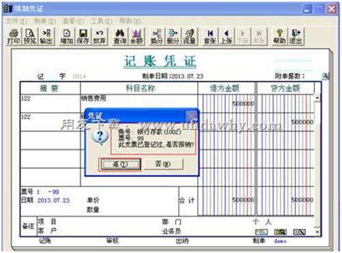 b、支票登記完之后,報銷費用時填制憑證提示;“賬號:銀行存款(1002),票號:(99),此票據(jù)已登記過,是否報銷?”點擊“是”,如下圖;