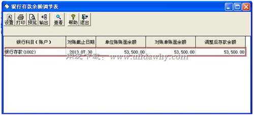 9、點擊“現(xiàn)金銀行”-“余額調(diào)節(jié)表”會顯示出“銀行存款科目、對賬截止時間以及調(diào)整后的余額數(shù),如下圖;