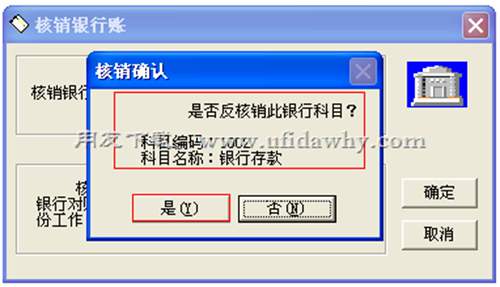 14、反核銷,點擊“核銷銀行賬”界面按住快捷鍵(ait+u)提示;“是否反核銷銀行科目?科目編碼(1002)、科目名稱(銀行存款)”,如下圖;