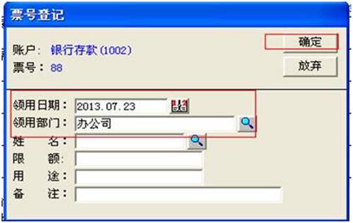 b、支票報銷時填寫;領(lǐng)用日期以及領(lǐng)用部門,點擊確定,如下圖;