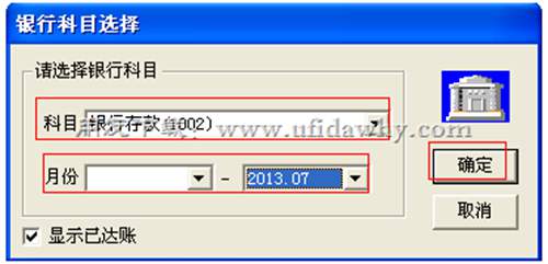 6、點擊“銀行對賬”-選擇“銀行存款”科目以及“月份”確定,如下圖;