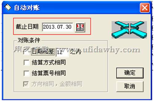 7、進入銀行對賬單界面,可以看到“單位日記賬”和“銀行對賬單”,點擊“對賬”,點擊“對賬”之后,選擇對賬的條件,取消“日期相差、結(jié)算方式相同以及結(jié)算票據(jù)號相同”,截止時間可以自由選擇,如下圖;