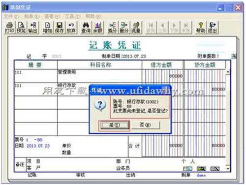 a、期初錄入完之后,就可以開始填制憑證了,當(dāng)填寫到支票控制的科目時就會有提示;“賬號:銀行存款;票號88,此支票尚未登記,是否登記?”,如下圖;
