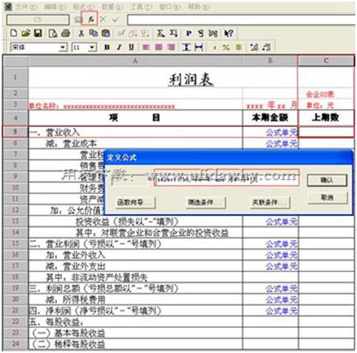 “select(?B5,年@=年 and 月@=月+1)”意思為取本報(bào)表文件中上月對應(yīng)的表頁B5單元格的值(注意:用此公式必須采用追加表頁的形式,才能取到上期數(shù),在第3步中會講追加表頁的方法。),如,“營業(yè)收入”單元格為C5,此處公式應(yīng)改為select(?B5,年@=年 and 月@=月+1),如下圖: