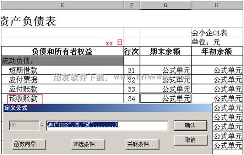 編制資產(chǎn)負(fù)債表時(shí),單元公式應(yīng)該設(shè)置為:應(yīng)收賬款:QM("1122",月,"借",,,,,,,) ;預(yù)收賬款:QM("1122",月,"貸",,,,,,,,)