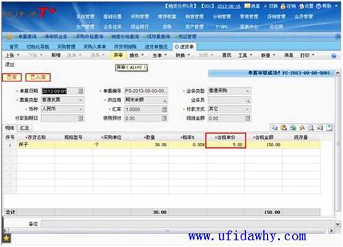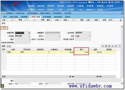 (1)舉例說明:8月1日入庫30個杯子暫估成本3元/個,9月1日收到30個杯子的發(fā)票單價5元/個。填寫8月1日采購入庫單,杯子30個,單價3元。