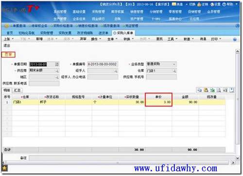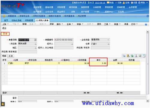 (1)舉例說明:8月1日入庫30個杯子暫估成本3元/個,8月16日只收到10個杯子的發(fā)票單價5元/個,填寫8月1日采購入庫單,杯子30個,單價3元
