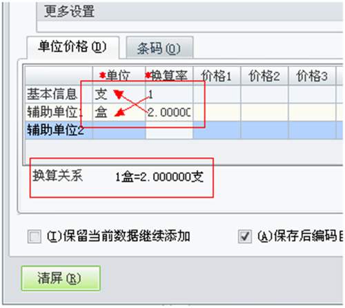 基本單位和輔助單位:例如1盒蘭蔻眼精華中有2支。在設(shè)置基本單位和輔助單位時(shí),要選擇小單位(支)作為基本單位,大單位(盒)作為輔助單位。換算關(guān)系為2。