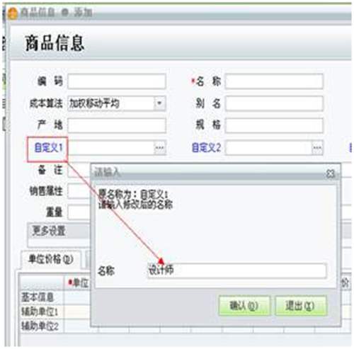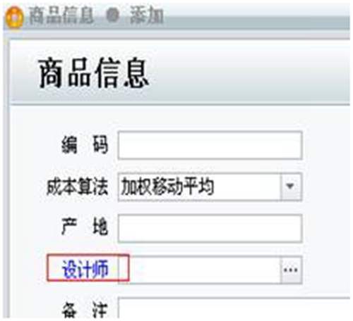 關(guān)于自定義:雙擊一下添加商品信息界面的自定義幾個(gè)字,就會(huì)彈出自定義一的顯示設(shè)置,例如軟件中沒(méi)有設(shè)計(jì)師一項(xiàng),我們可以通過(guò)自定義一來(lái)顯示