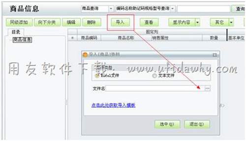 (3)回到用友T1商貿(mào)寶進(jìn)銷(xiāo)存管理軟件中,點(diǎn)擊導(dǎo)入,在彈出的界面再點(diǎn)擊文件名后的省略號(hào),選擇之前模版保存路徑。