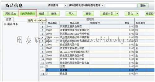 方法一:在建立好的商品大類(lèi),點(diǎn)擊向下分類(lèi):