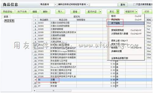 (2)再找到蘭蔻這個(gè)商品大類(lèi)的商品,選中,再點(diǎn)擊其他中的向下粘貼。詢問(wèn)是否粘貼的提示,點(diǎn)擊確定。