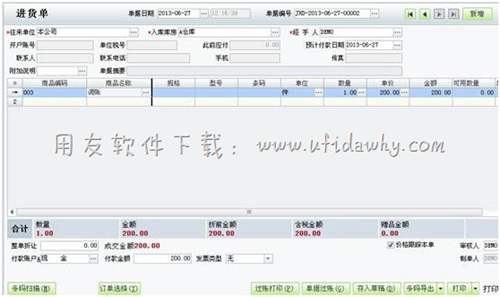 第四步:現(xiàn)實(shí)中是以3000元銷售收入減去回扣和稅款。軟件中為了開票,做單據(jù)時(shí)錄制的是3200元銷售收入,以3200元的收入減去回扣和稅款。這樣就會(huì)形成200元的差額,調(diào)整這個(gè)差額可以做一張進(jìn)貨單,商品為虛擬的調(diào)賬。這個(gè)商品不用來出售,不形成利潤(rùn)。這樣就可以只減少錢流,不影響利潤(rùn)。