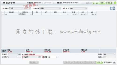 假設退回20個達芙妮女包,做銷售退貨單,不輸入付款金額