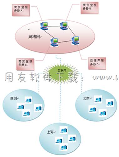 某商貿(mào)公司,由于公司規(guī)模比較大,購買了一套100用戶的用友T1商貿(mào)寶批發(fā)零售版V12.0免費(fèi)版進(jìn)銷存軟件。這款進(jìn)銷存軟件使用人員分布在深圳、北京、上海等三個地方。深圳需要40站點(diǎn),北京和上海各需要30站點(diǎn)??蛻粝雽?shù)據(jù)集中在北京進(jìn)行管理,也就是說服務(wù)器搭在北京,其他做為客戶端共享服務(wù)器數(shù)據(jù),如何組網(wǎng)能使各個地區(qū)正常使用用友T1免費(fèi)版進(jìn)銷存軟件。