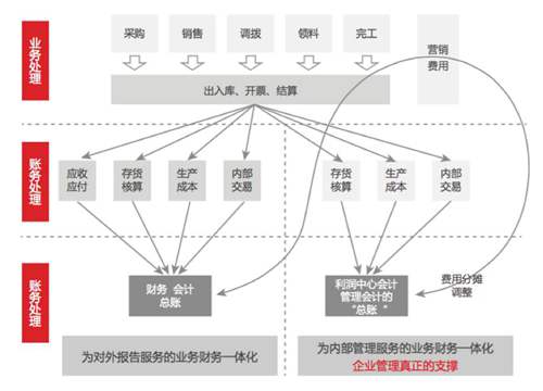 業(yè)務(wù)財(cái)務(wù)一體化:一次業(yè)務(wù)處理,財(cái)務(wù)會(huì)計(jì)、管理會(huì)計(jì)平行處理完成核算;
