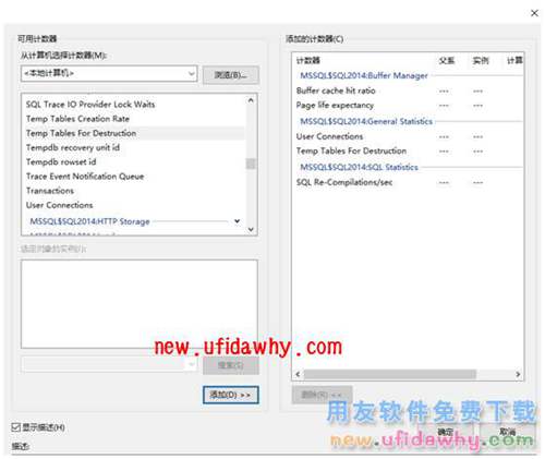 ③單擊“添加”以添加計(jì)數(shù)器。在“可用計(jì)數(shù)器”列表中,選擇要監(jiān)視的性能對象。 SQL Server 默認(rèn)實(shí)例的 SQL Server 性能對象名稱以 SQL Server 開頭,命名實(shí)例以 MSSQL$instanceName 開頭。