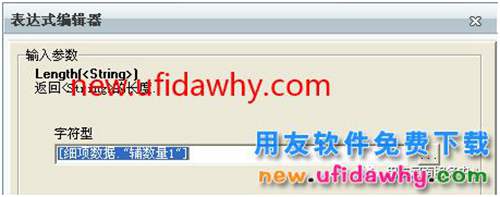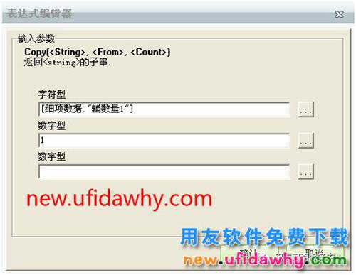 4、在參數輸入界面,字符型選擇要細項數據輔數量1,下面兩個數字型是取數起始位(from)和取數總位數(count)。在此次取數中,要從第一位開始,取除了最后漢字位的所有數,這個位數由于不確定,所以需要用到字符長度函數。