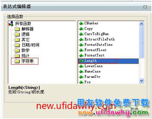5、點擊最下方數字型的右側三個點的按鈕,進入表達式編輯器,選擇“函數”,右側選擇使用字符串中的“l(fā)ength”函數,點擊繼續(xù)。長度函數取字段輔數量1的整體長度。