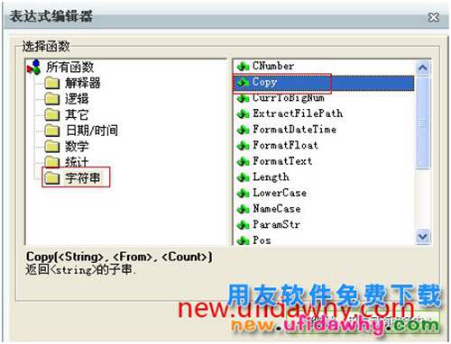 3、雙擊單元格,清空文本編輯器的內容,點擊“fx表達式”,在彈出的編輯器中選擇“函數”,右側選擇字符串copy函數,點擊繼續(xù)。