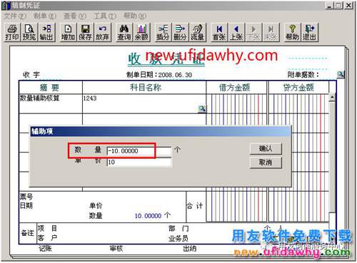 方案三、“輔助項(xiàng)”彈出之后,在“數(shù)量”里面錄入負(fù)數(shù),“單價(jià)”正常錄入,那樣在借方就是一筆紅字的分錄,其意義跟貸方藍(lán)字是一樣的。
