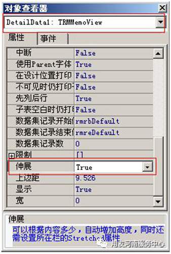 2、再次右鍵點(diǎn)擊此單元格選擇屬性,在彈出的對(duì)象查看器上方選擇“detaildata1”,將“伸展”設(shè)置為“true”。