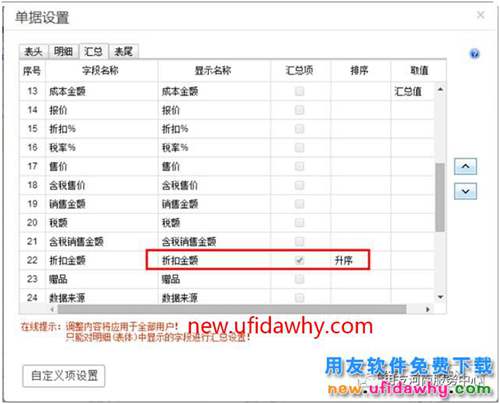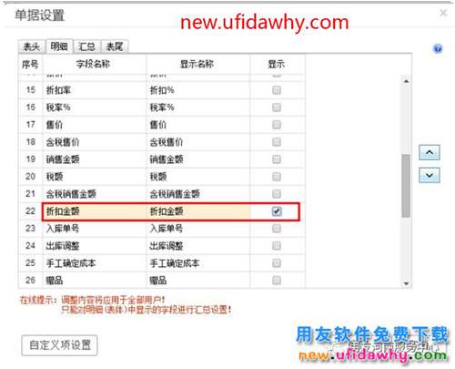 需要將折扣金額匯總的勾去掉,但是現(xiàn)在灰色的,需要在操作-設(shè)置-明細中,將折扣金額字段勾上顯示,匯總頁簽折扣金額字段就去掉匯總勾,重新打印即可,如下圖所示: