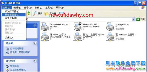 1.點(diǎn)擊左面左下角“開始”按鈕,在設(shè)置中找到“打印機(jī)和傳真”,打開界面后,之后點(diǎn)擊左上角的的文件,選擇“服務(wù)器屬性”