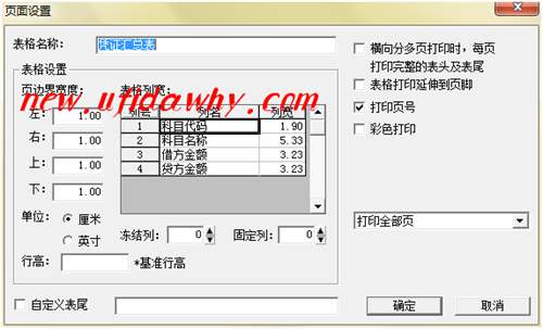 2、“橫向分多頁(yè)打印時(shí),每頁(yè)打印出完整的表頭及表尾”選項(xiàng)說(shuō)明,確定當(dāng)表格的寬度過(guò)寬,在一個(gè)頁(yè)面內(nèi)打印不下、需要分幾頁(yè)打印時(shí),表頭,表尾的輸出方式。如果選定該選項(xiàng),則打印輸出的每頁(yè)中均有完整的表頭及表尾,如果不選此項(xiàng),系統(tǒng)會(huì)將全部橫向輸出的頁(yè)面做為一個(gè)表格對(duì)象輸出一個(gè)表頭及表尾,就象把所有橫向輸出的頁(yè)面拼接起來(lái)一樣。