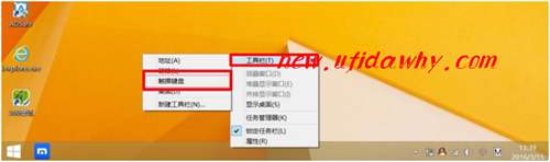 步驟一 將光標(biāo)置于電腦桌面最底部的任務(wù)欄,點(diǎn)擊鼠標(biāo)右鍵,選擇”工具欄”命令,取消勾選“觸摸鍵盤”,如下圖所示: