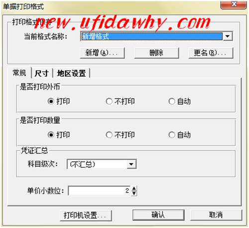 第二步:點(diǎn)擊“打印記賬憑證”窗口的【打印設(shè)置】按鈕,用戶可以新增、刪除已經(jīng)更名當(dāng)前格式名,根據(jù)需要在“常規(guī)”頁(yè)標(biāo)簽對(duì)打印格式進(jìn)行調(diào)整,“常規(guī)”設(shè)置項(xiàng)比如是否打印外幣、是否打印數(shù)量、憑證匯總科目級(jí)次以及單價(jià)小數(shù)位。