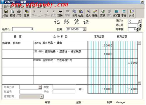 實例詳情:2016年3月10日,萬通電子有限公司從艾勝電器公司購入鍵盤20個,單價50元,已入庫存放倉庫,貨款尚未支付,錄入記-3憑證。