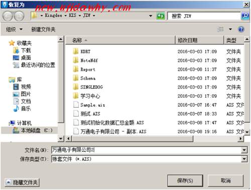 溫馨提示:在金蝶KIS記賬王賬套恢復(fù)過程中,用戶需要分清備份文件窗口和賬套文件窗口,恢復(fù)時(shí)是以賬套的形式呈現(xiàn),因此在同一目錄下賬套文件名不能重復(fù),否則不能保存文件,這就是為什么命名是添加后綴2或者副本的意義所在。