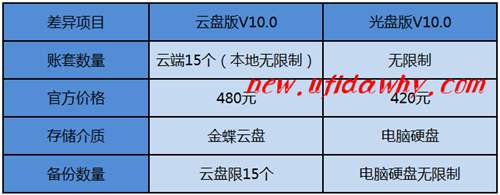 金蝶KIS記賬王V10.0兩個版本仍有幾個比較小的差別,主要體現(xiàn)在賬套存儲數(shù)量、官方售價、存儲介質(zhì)以及備份數(shù)量4個方面,為了更加清晰地展現(xiàn)兩個版本的不同之處,小編已經(jīng)整理成表,如下圖所示: