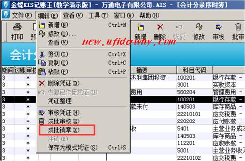 步驟二 在進(jìn)入會(huì)計(jì)分錄序時(shí)簿后,選擇并點(diǎn)擊“編輯”菜單欄下的“成批銷章”命令。操作過程圖如下所示: